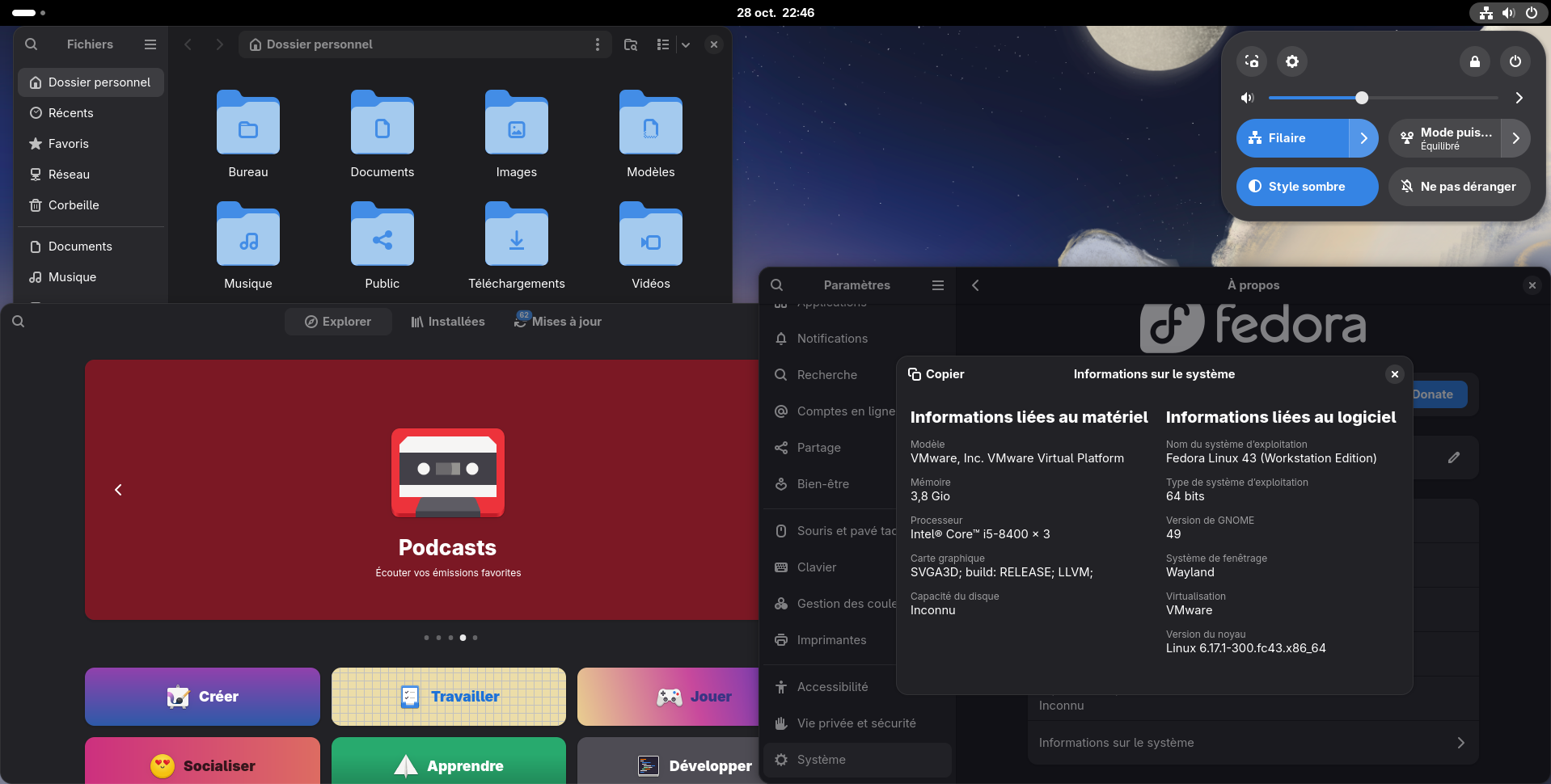 Fedora est un système d’exploitation libre et une distribution Linux communautaire développée par le projet Fedora et chapeautée par l’entreprise Red Hat. Fedora est une sorte de vitrine destinée à inclure les dernières nouveautés du monde du logiciel libre, elle contribue largement aux projets tels que le noyau Linux, GNOME, NetworkManager, PackageKit, PulseAudio, Wayland, la célèbre suite de compilateurs GCC et bien d’autres encore...