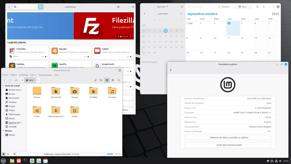 Côté interfaces, Linux Mint se décline en 3 environnements : Cinnamon (l'officielle) puis 2 plus légères : XFCE et MATE (basé sur Gnome 2).