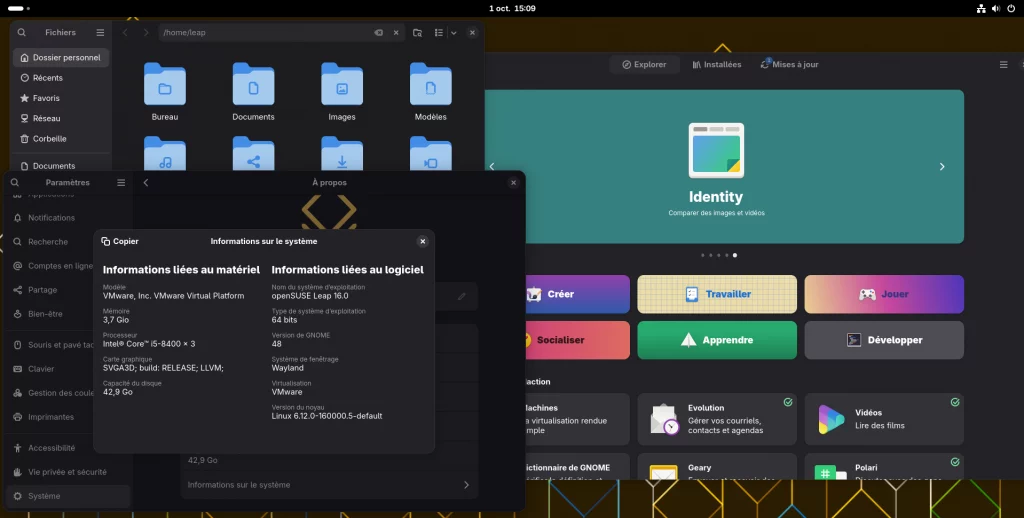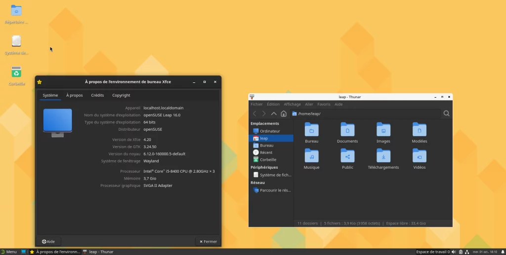 OpenSUSE utilise le format de paquets RPM et propose de base trois environnements de bureau : Gnome, KDE et XFCE