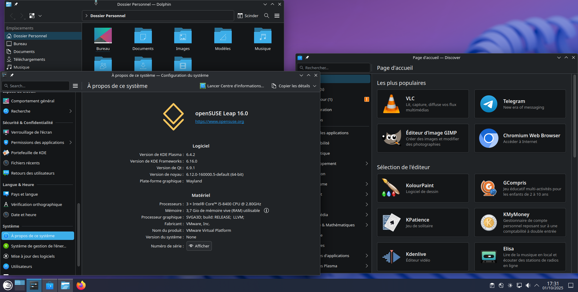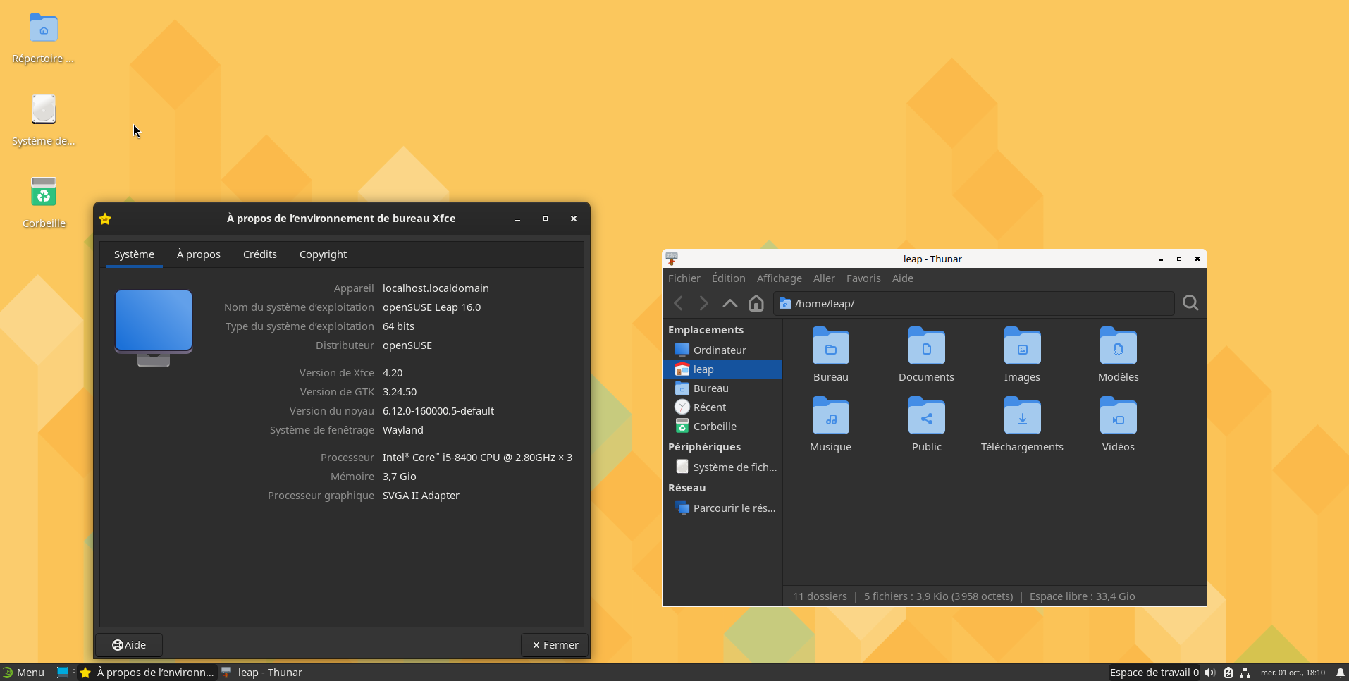 OpenSUSE utilise le format de paquets RPM et propose de base trois environnements de bureau : Gnome, KDE et XFCE